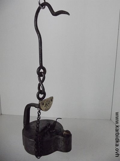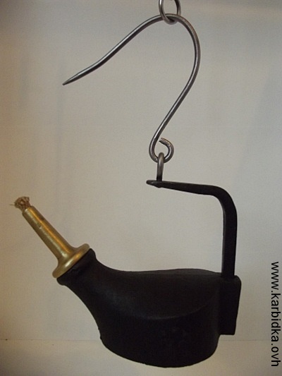 Kaganek łojowy żeliwny prwdopodobnie wyprodukowany przez Eisenwerke Röchling Völklingen w Zagłębiu Saary (oznakowanie -logo- producenta na boku kaganka) pod koniec XIX wieku .....