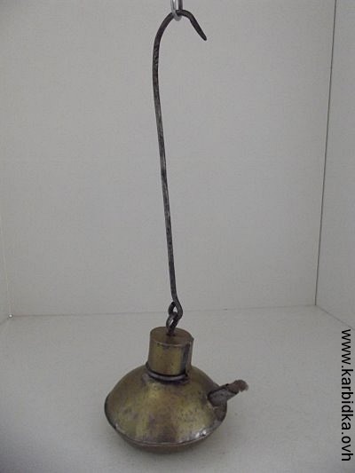 Kaganek olejowy mosiężny z elementami stalowymi - hakiem i tuleją knotową, producent nieznany, miejsce odnalezienia - okolice Krakowa (kopalnie soli?) ...