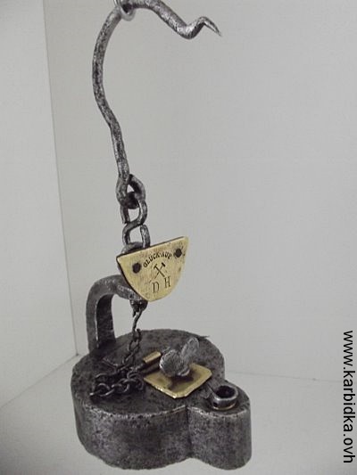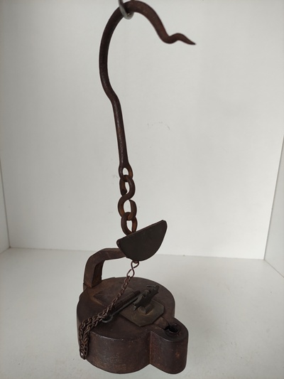 Kaganek łojowy żeliwny prwdopodobnie wyprodukowany przez Eisenwerke Röchling Völklingen w Zagłębiu Saary (oznakowanie -logo- producenta na boku kaganka) pod koniec XIX wieku .....